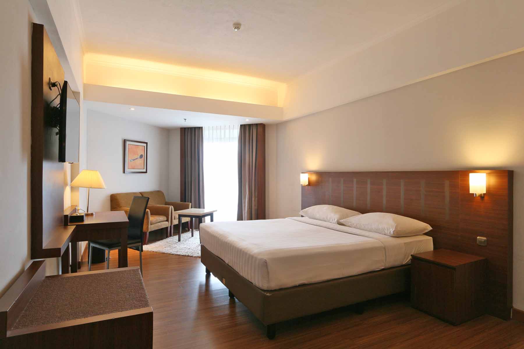 Deluxe room is designed uniquely and comfortable. The semi classic yet modern interior creates a feel of warmth and ease that is found at home. Deluxe Room is inspiring in order to accommodate the MICE group. With total of 145 rooms, each has twin or double beds and a sofa.